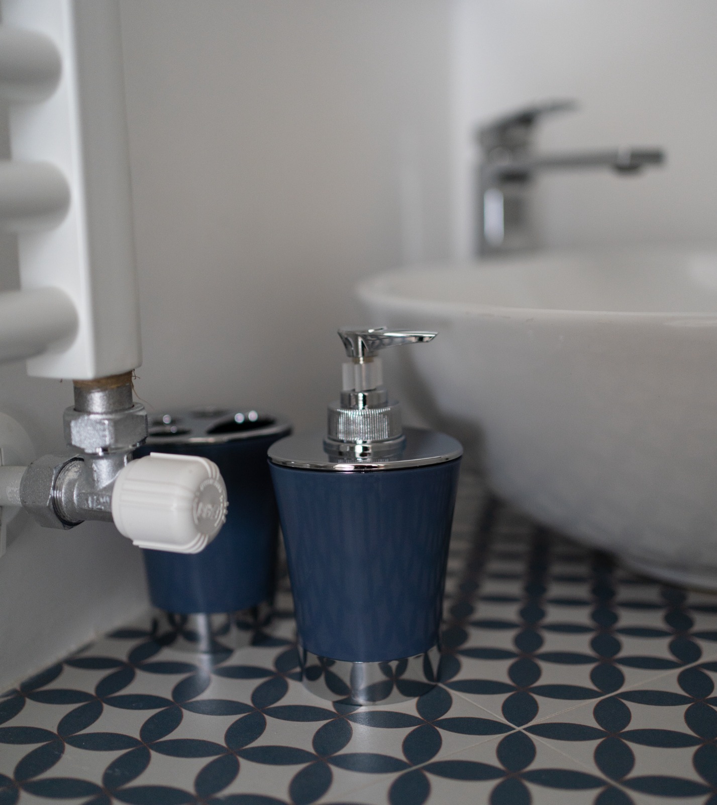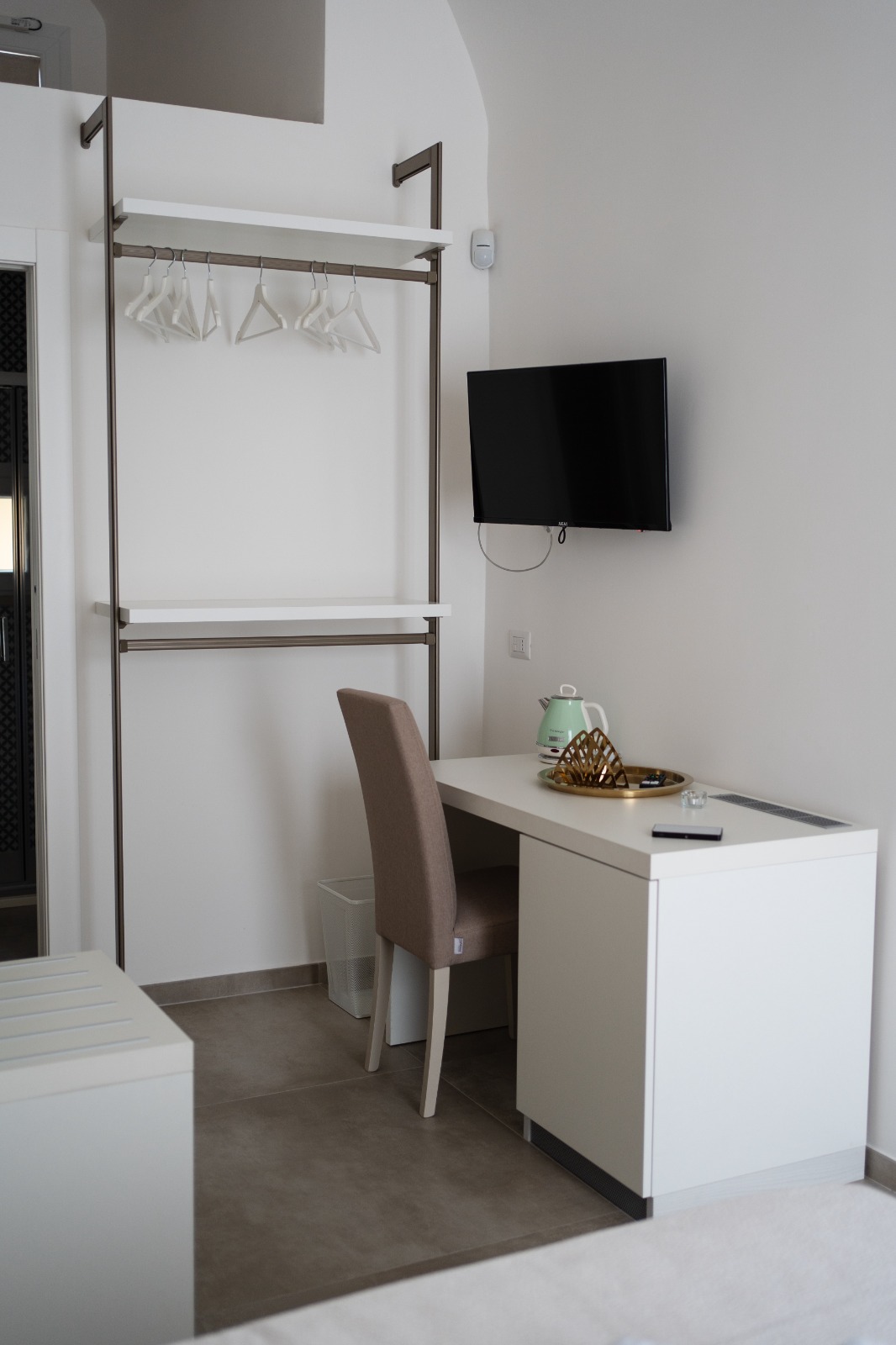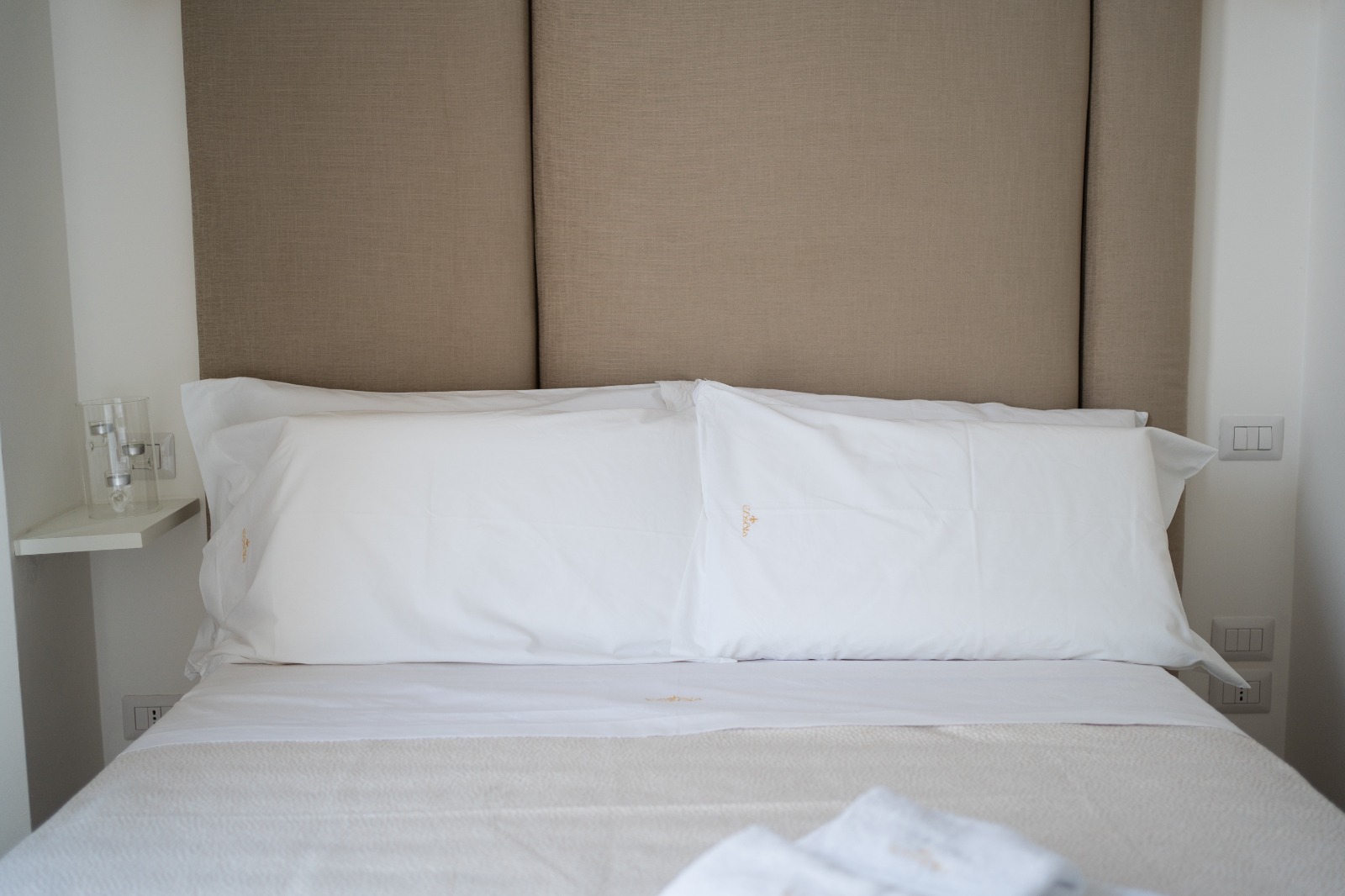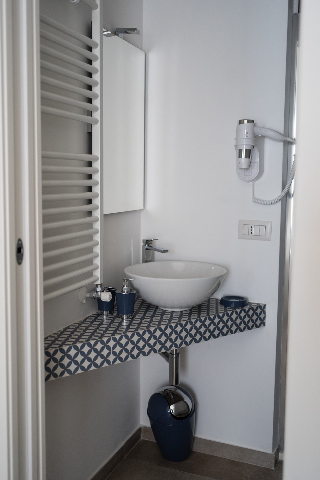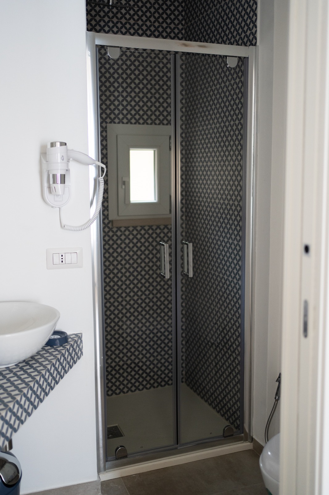 Camera matrimoniale due posti con letto alla francese, bagno privato con doccino e doccia.