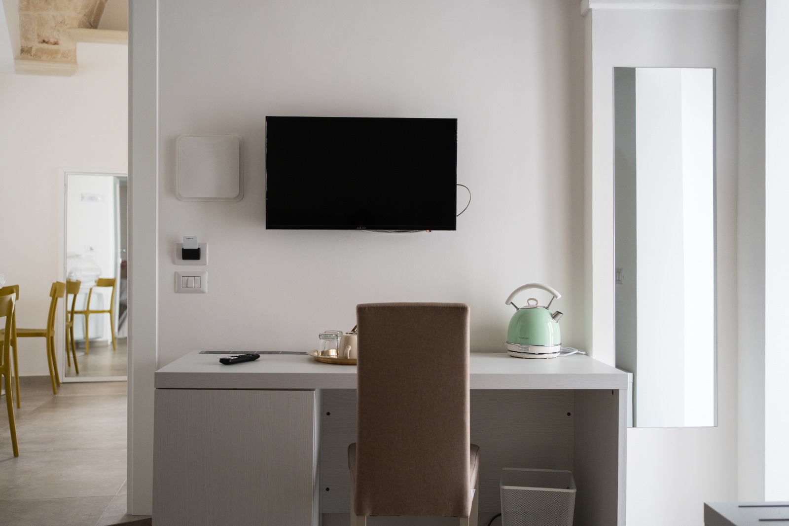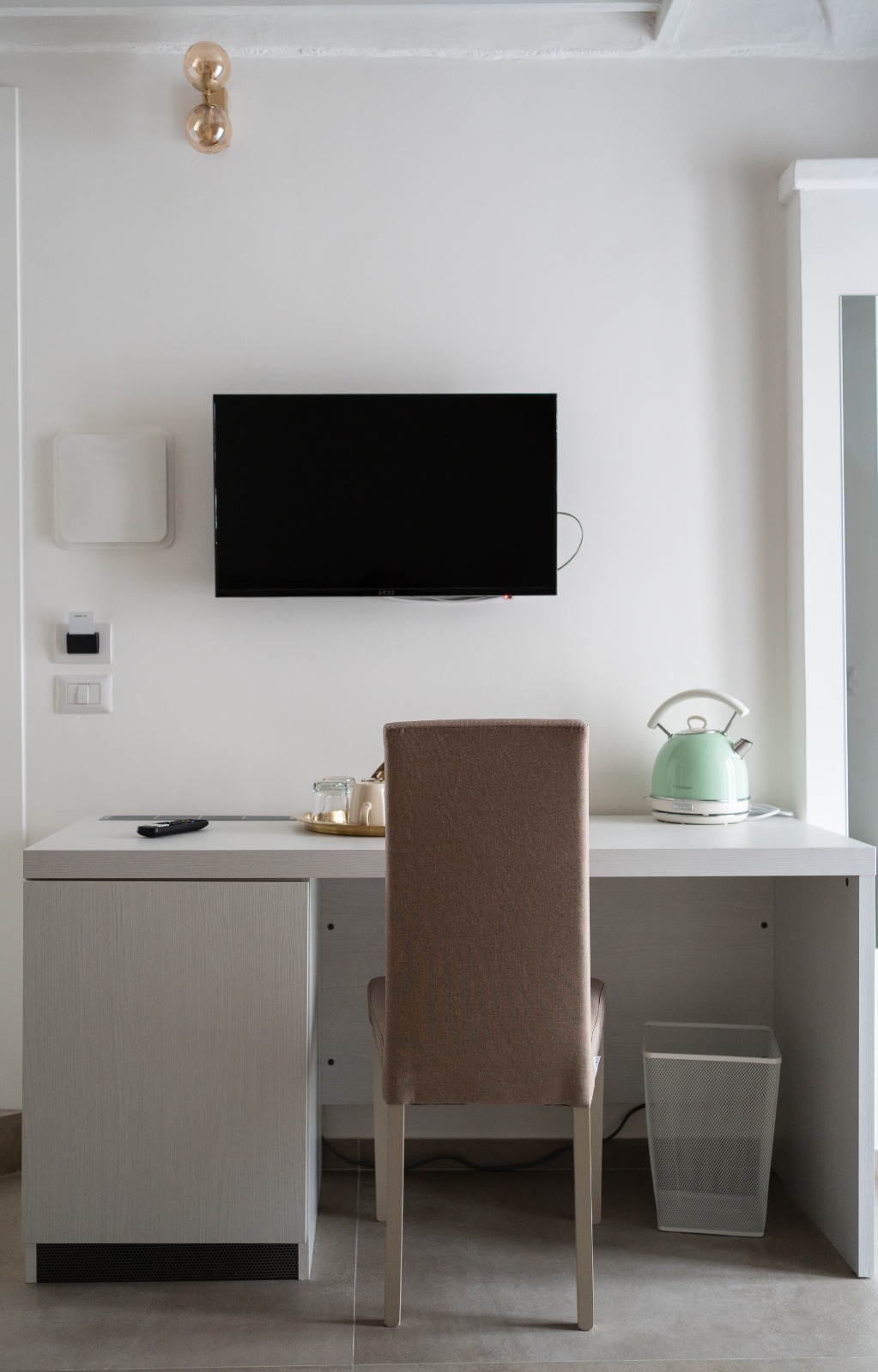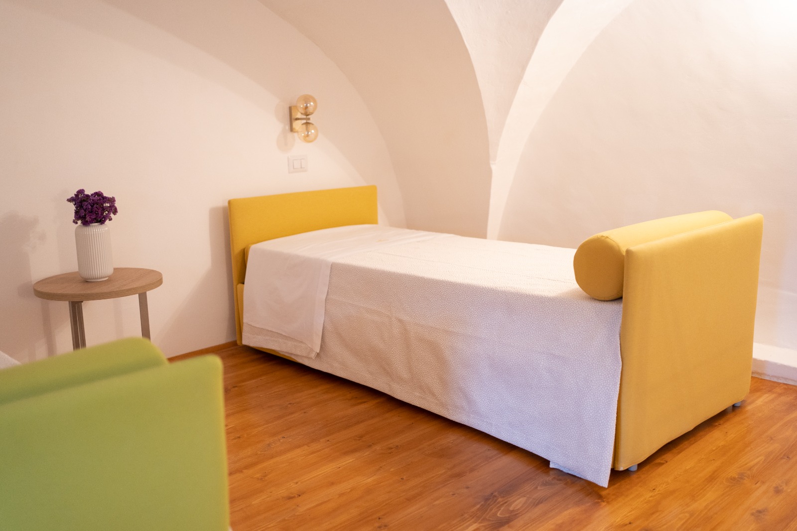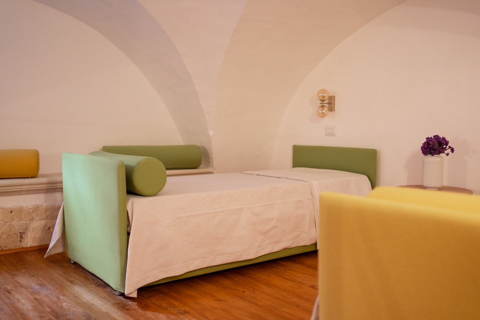 Camera familiare, 5 posti letto (1 letto Matrimoniale e tre singoli), dotata di soppalco con bagno privato con doccino e doccia. frigobar, smart tv, riscaldamento autonomo, wifi gratuito, fornitura di lenzuola e di asciugamani.